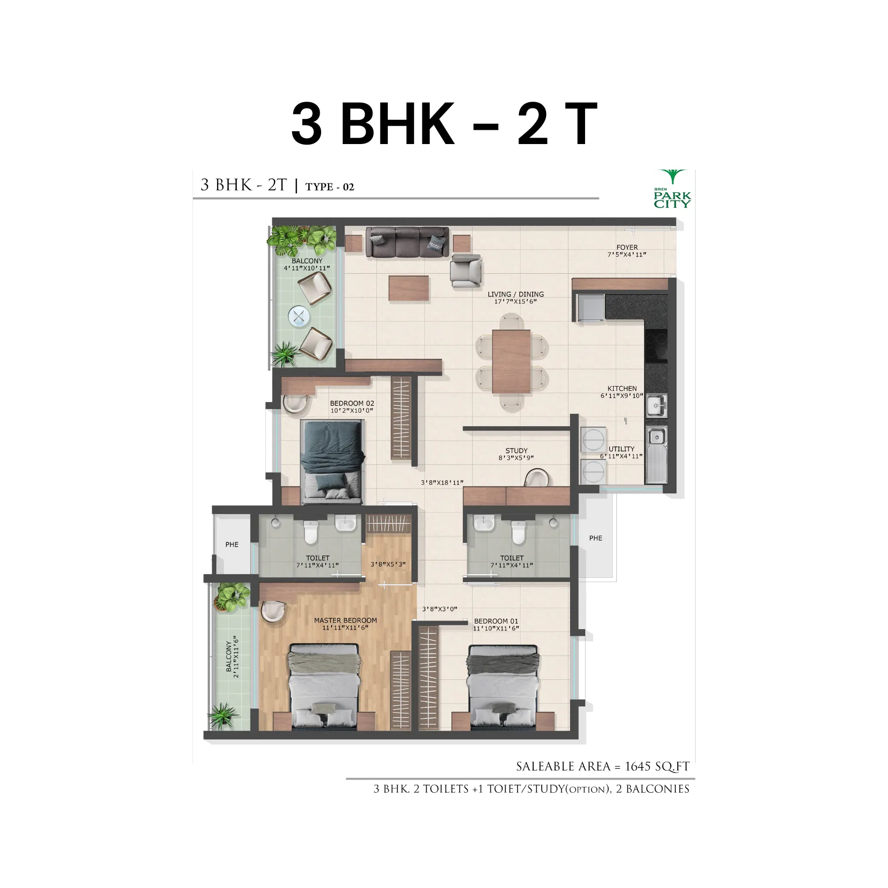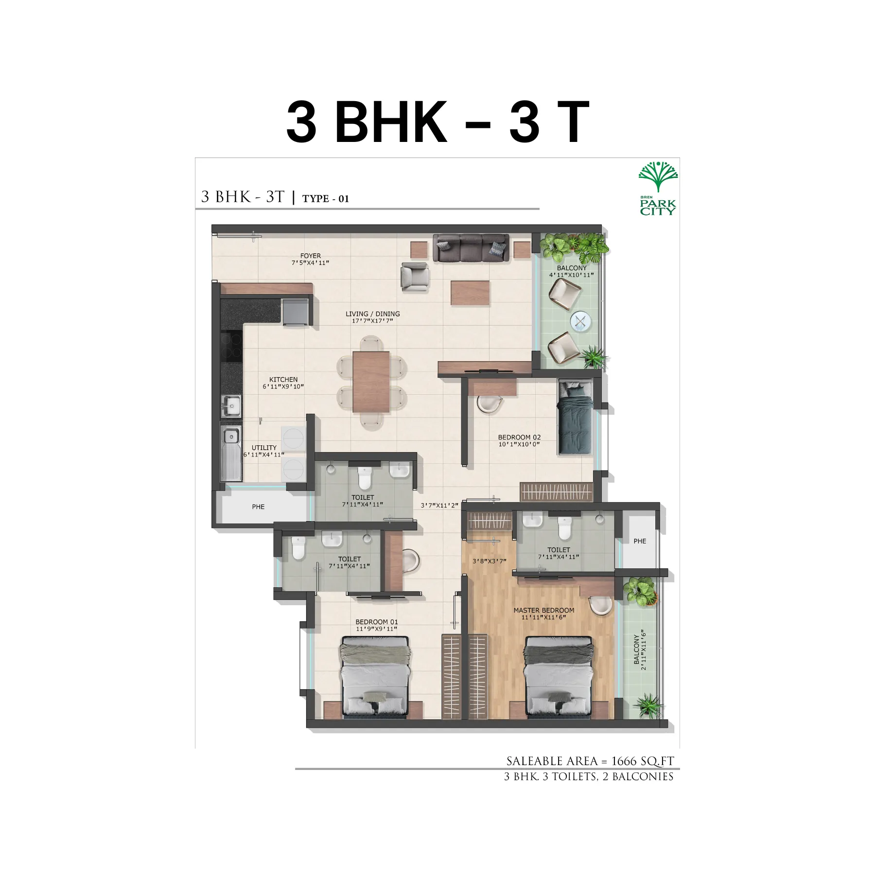 Spread across a large 10.2-acre land parcel, Bren Park City is envisioned as a self-sustained residential enclave offering spacious homes, landscaped gardens, and lifestyle amenities that promote healthy and balanced living. The project features 616 well-planned 3 BHK apartments housed within 6 residential towers, ensuring ample open space, ventilation, and a sense of openness rarely found in dense city developments.